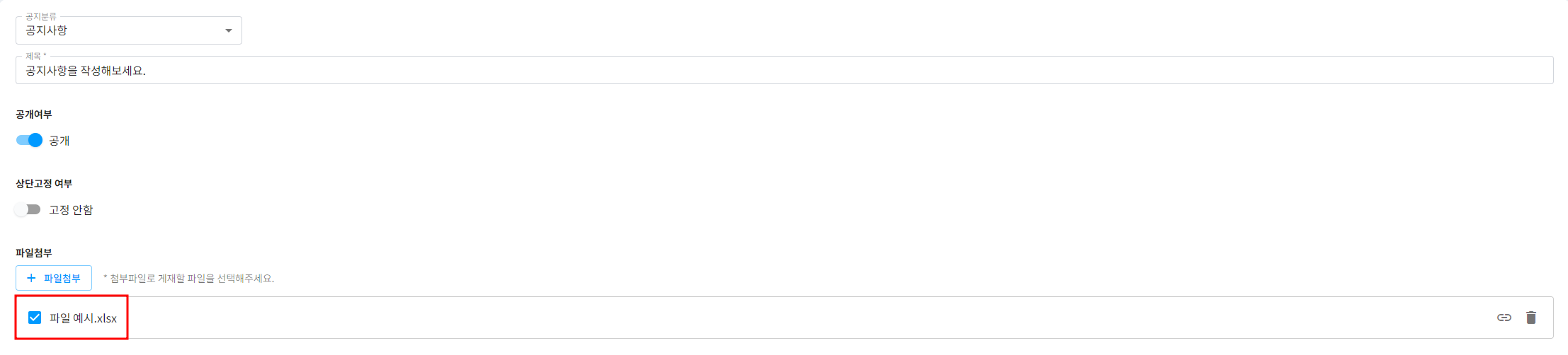 > 해당 공지에 첨부할 파일이 있다면 \[+파일첨부] 버튼으로 첨부할 수 있습니다.
