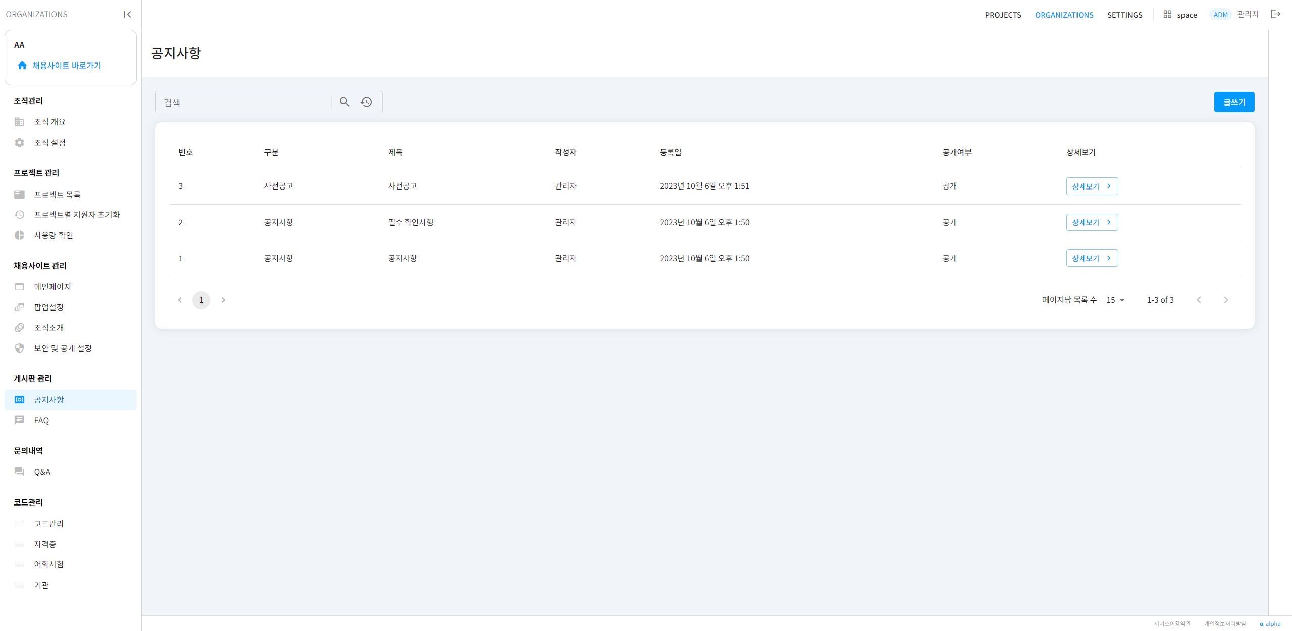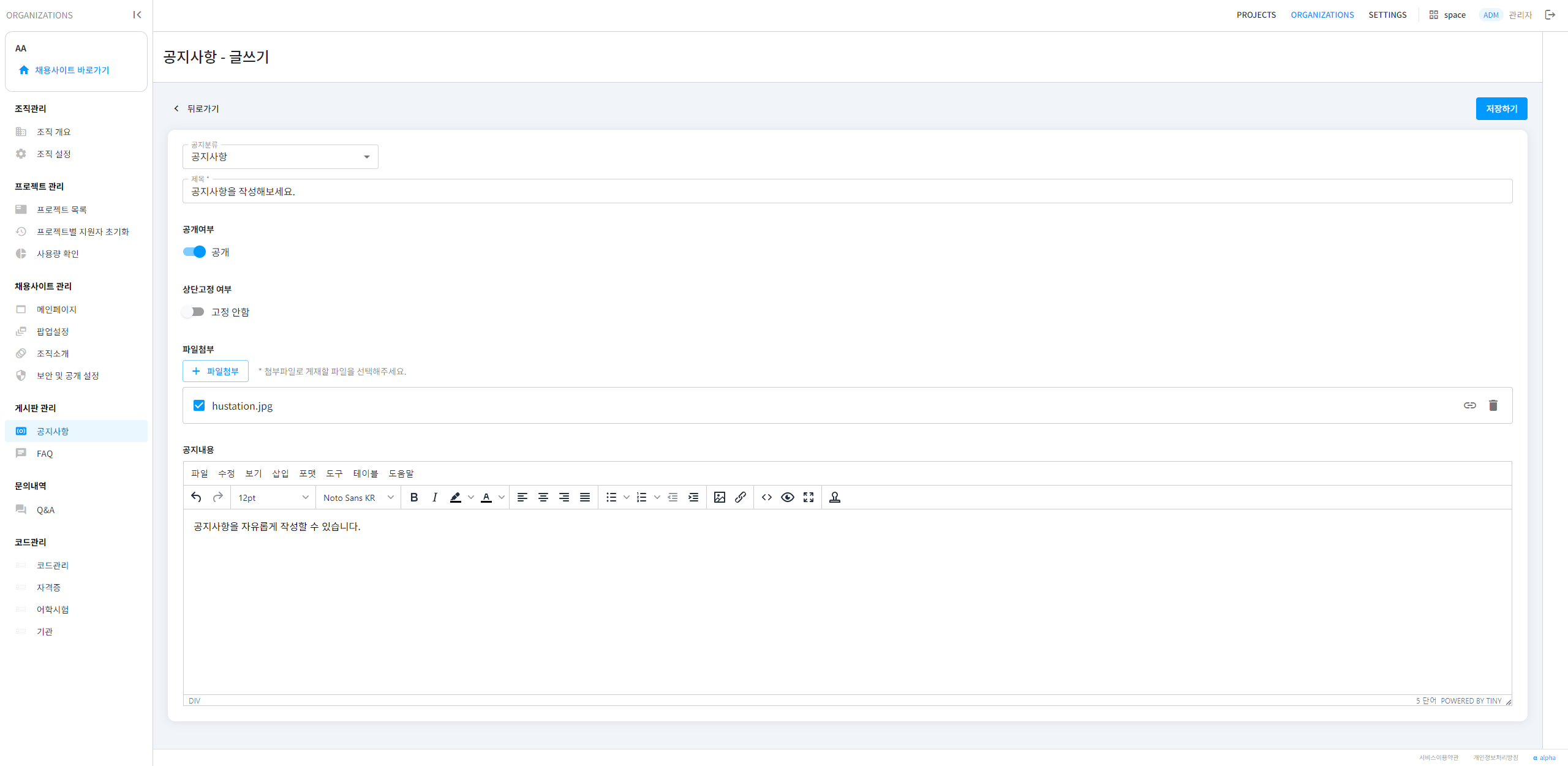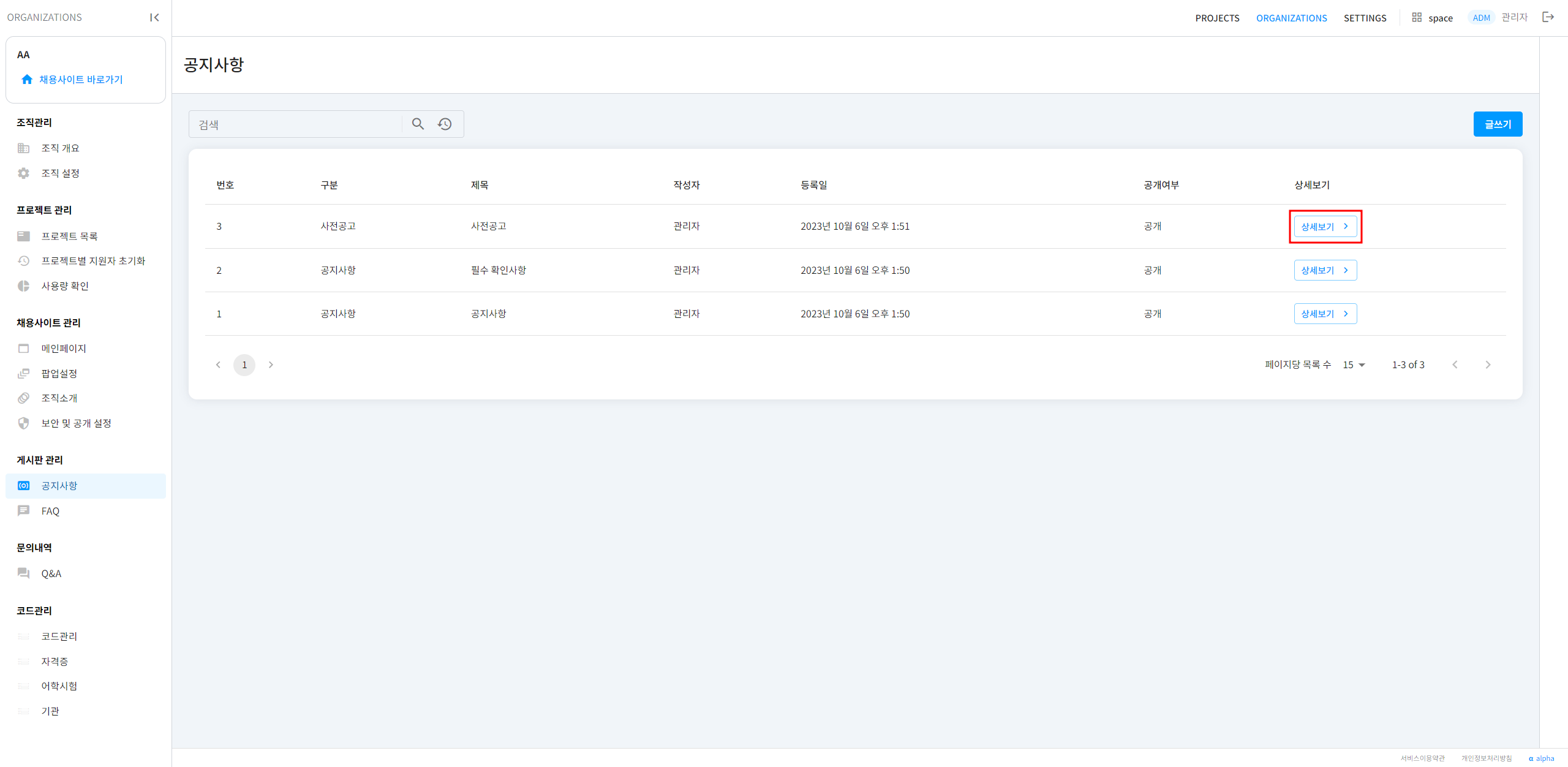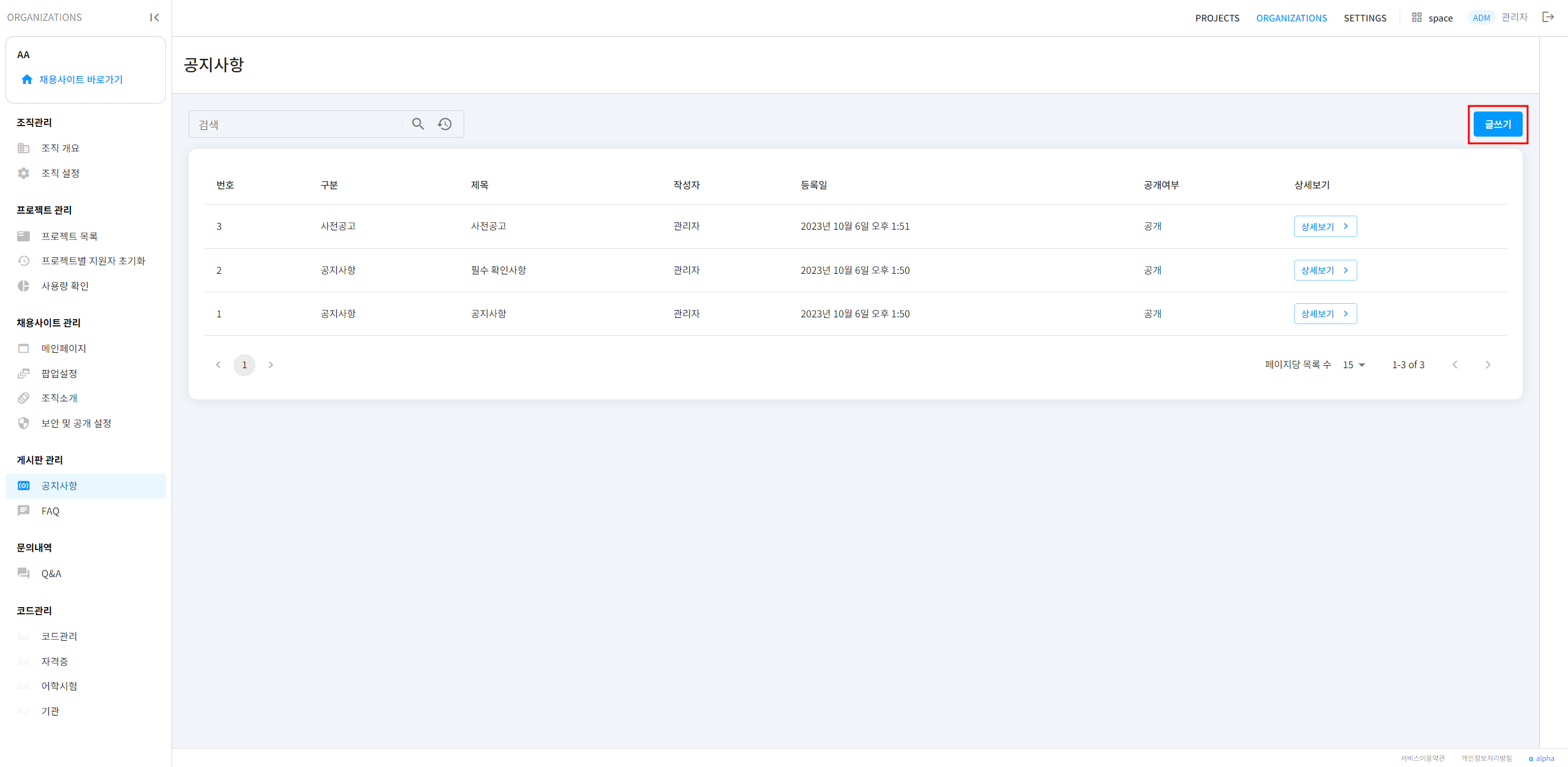 저장까지 마쳤다면, 채용사이트 - 공지사항에서 정상적으로 등록된 것을 확인하실 수 있습니다.