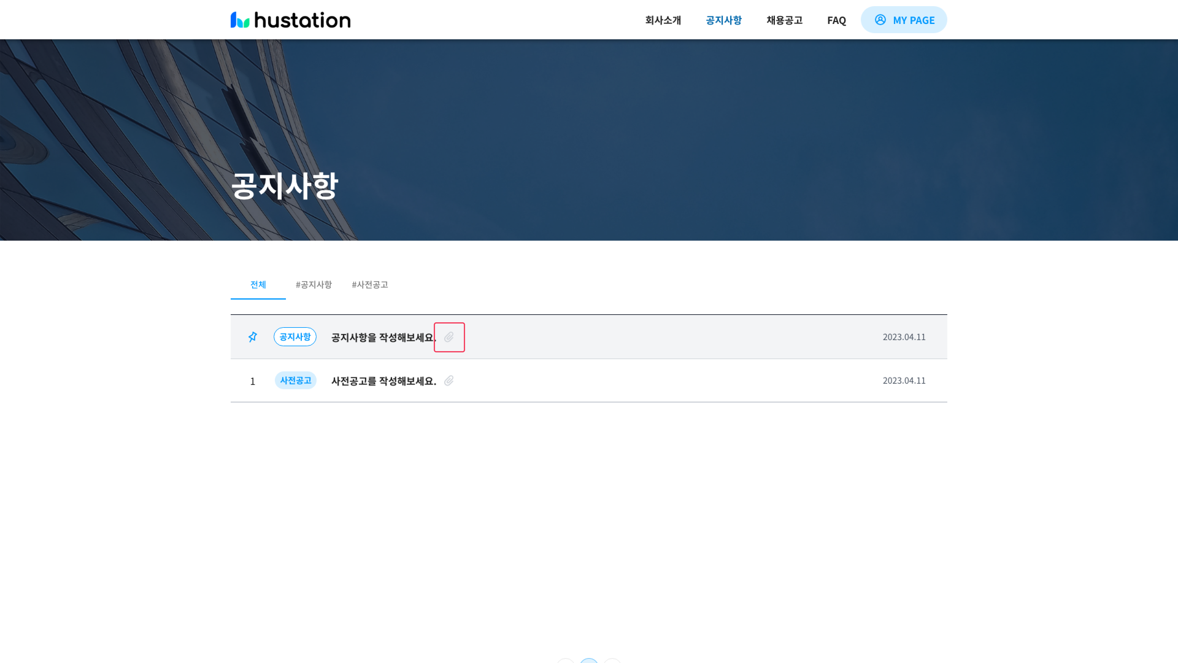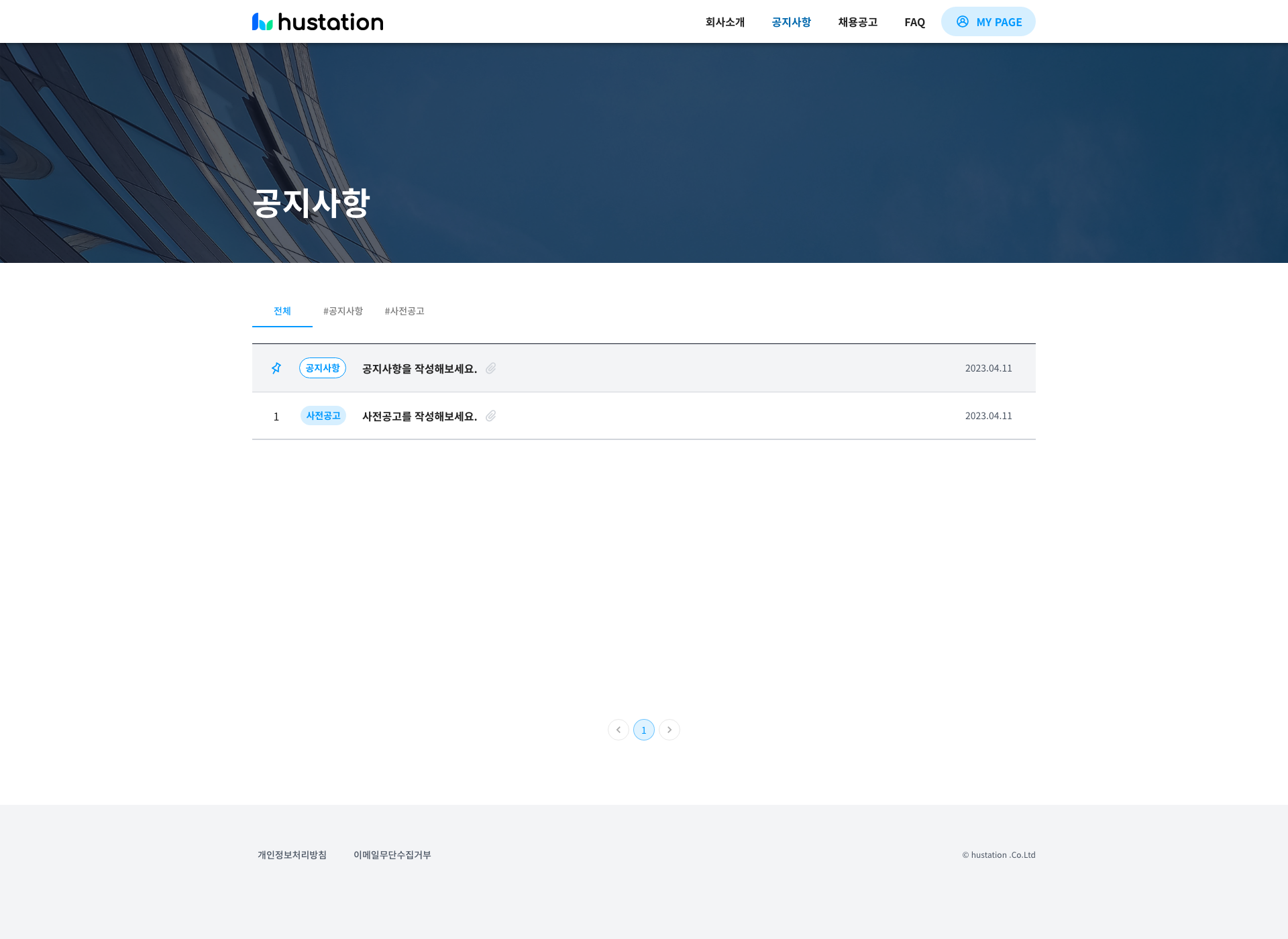 공지사항은 사전공고와 공지사항으로 나뉘어지며, 중요한 공지는 리스트 상단에 고정할 수 있습니다.