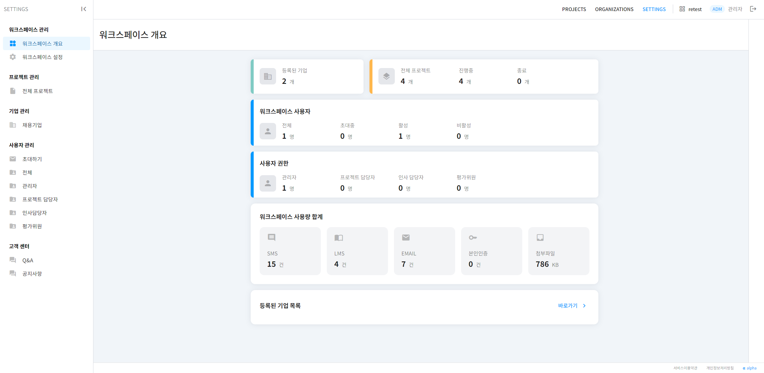 해당 워크스페이스의 등록된 기업, 프로젝트, 사용자 현황, 사용량 합계를 확인할 수 있습니다.
