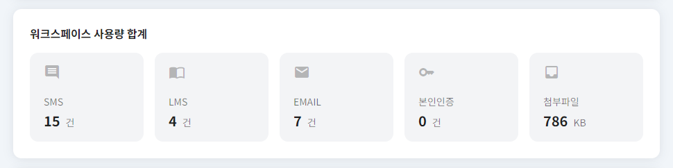 SMS, LMS, EMAIL, 본인인증, 첨부파일 등 모든 사용량을 확인할 수 있습니다.